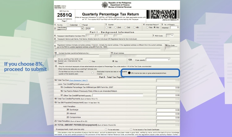 You only need to pay percentage taxes when you opt for the graduated income tax. But you have to submit this form once if you’re choosing the 8% as well. It will indicate that you are choosing the 8% tax for the calendar year.