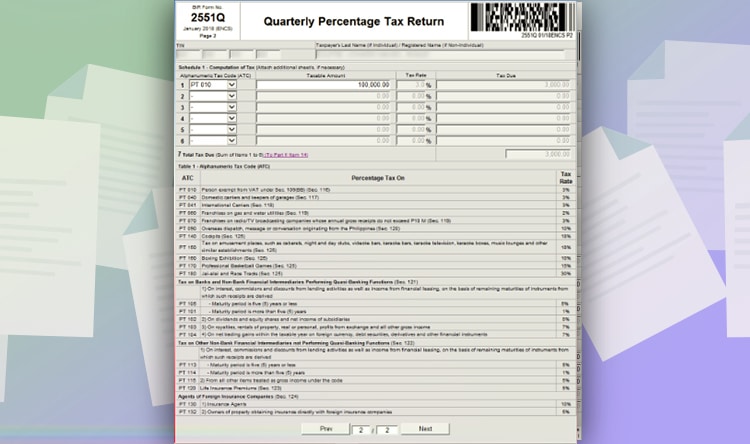 Choose BIR Form 2551Qv2018 – Quarterly Percentage Tax Return.
