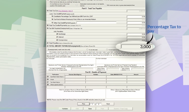 In this case, you will pay 3,000 PHP for percentage taxes. Check the details and click validate. If there is no missing information needed, you can file the form by clicking “Submit/Final Copy.”